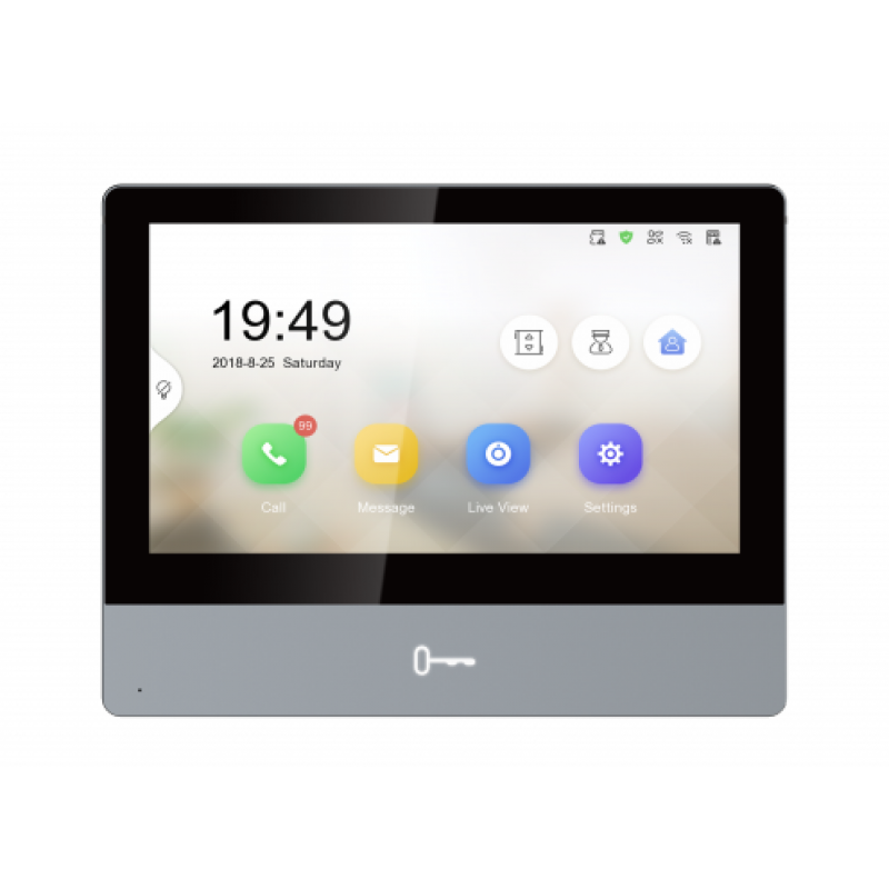 Stacja wewnętrzna, kolorowy, dotykowy ekran pojemnościowy LCD TFT 7“, rozdzielczość ekranu 1024 x 600, przyciski dotykowe, umożliwia komunikację interkomową, możliwość zdalnego odblokowywania drzwi, możliwość monitorowania stacji bramowej, wbudowany glośnik i mikrofon. 8-kanałowe wejście alarmowe, wyjście 2xalarmowe. Ethernet 10/100Mbps, Wi-Fi 802.11b/g/n, wbudowany slot na karte TF do 32 Gb. Montaż natynkowy. Zasilanie 12VDC/PoE. Pobór mocy 7W. Wymiary 180mm x 140 mm x22.4mm. Zdobywca nagrody Reddot 2017....